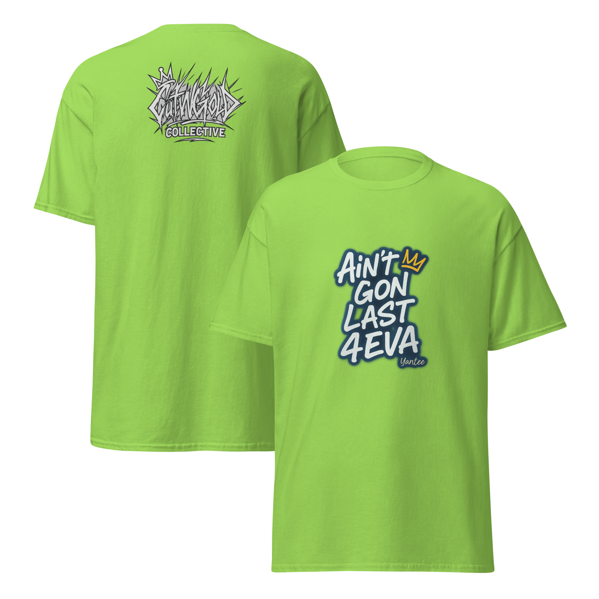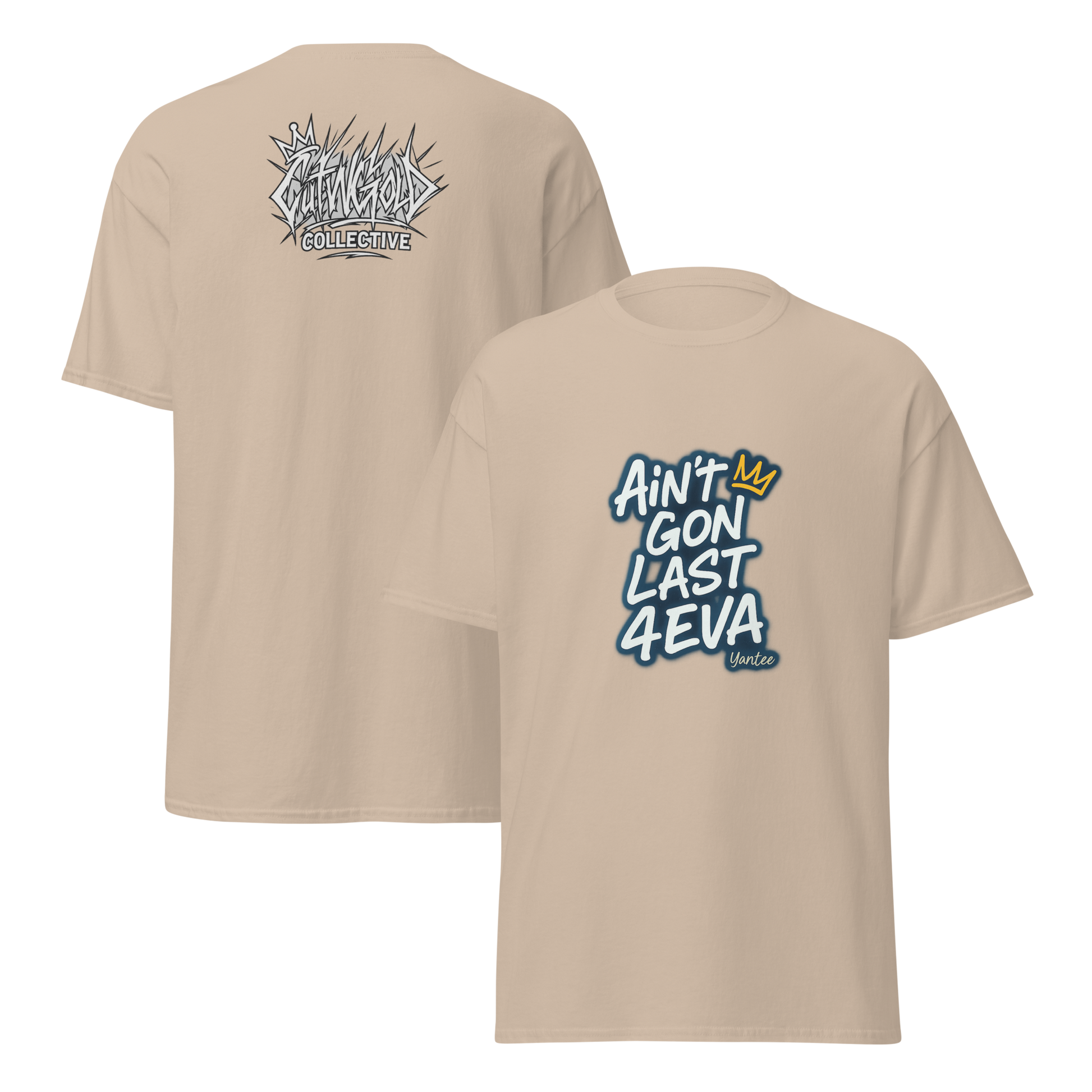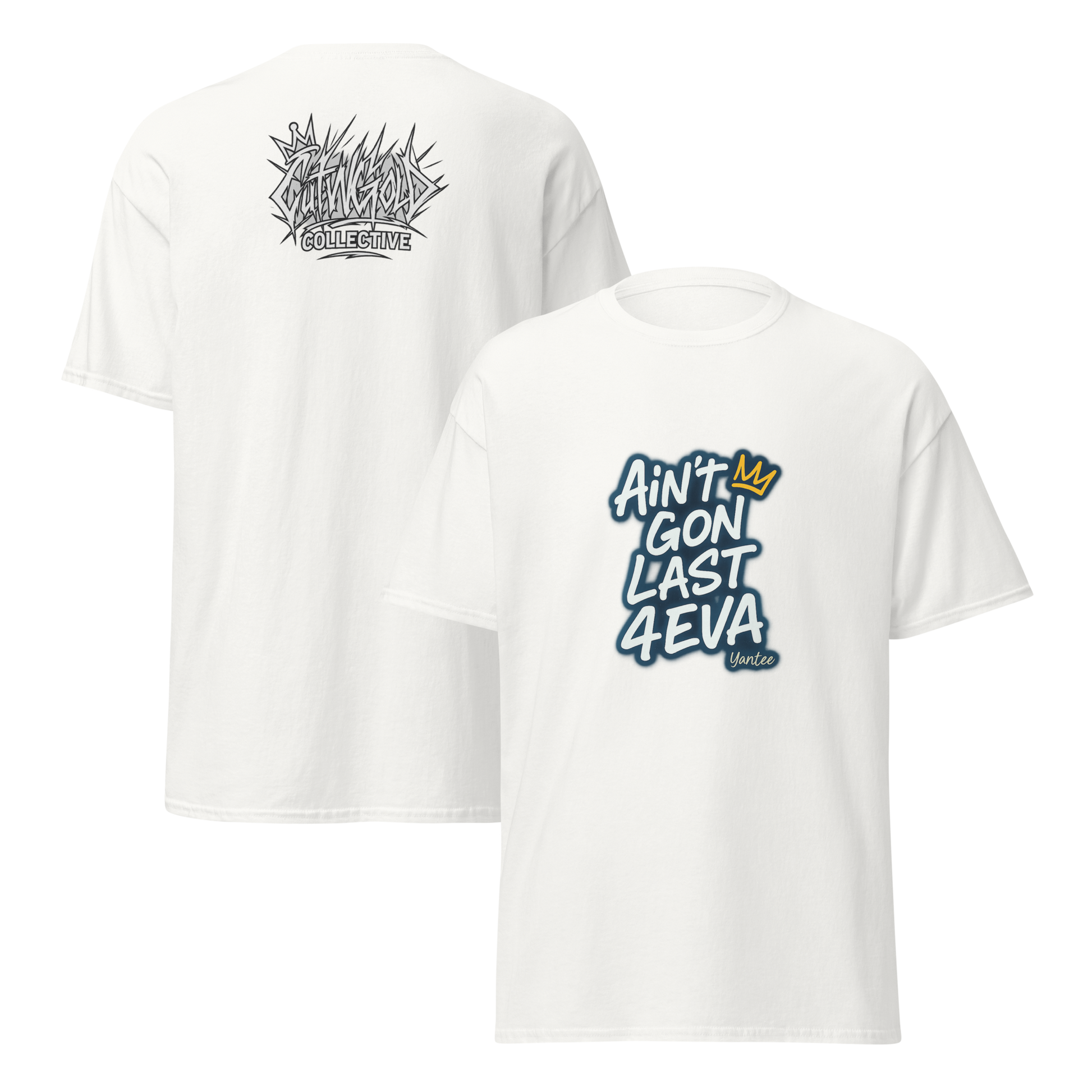 Back by demand, the "Ain’t Gon Last 4EVA" tee gets a fresh update. Featuring Yantee’s iconic lyric on the front, this drop now includes the bold "CutWGold Collective" logo stamped proudly on the back. Designed for those who know every moment counts, this tee blends streetwear grit with independent artist energy. Printed on premium cotton, built to last—even if forever won’t.